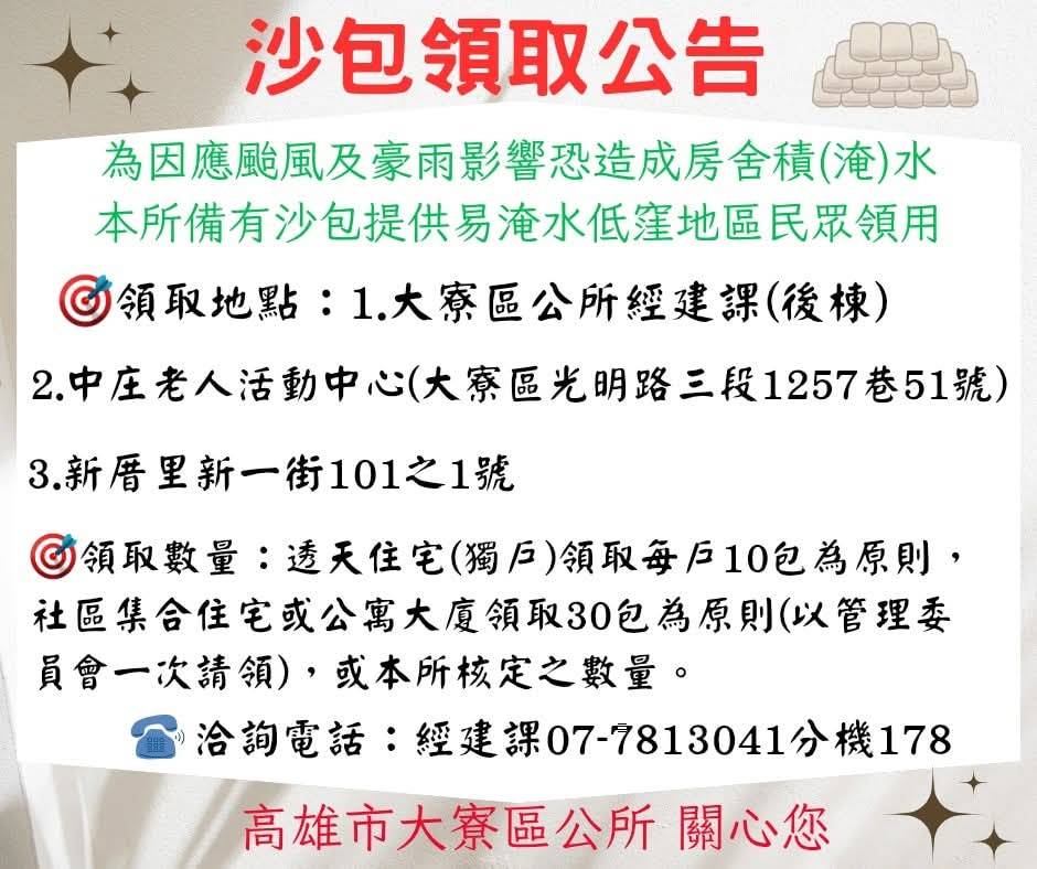 ➤ 保持居家陽台或頂樓排水孔暢通、準備砂包或安裝防水閘門➠請預先聯繫所在地區公所,了解砂包領取地點及回收方式,查詢各區公所電話 ➤ https://pse.is/55a6bk