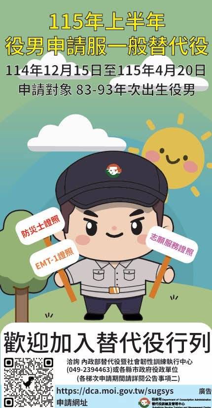 115年上半年「一般替代役」甄選規定出爐啦!